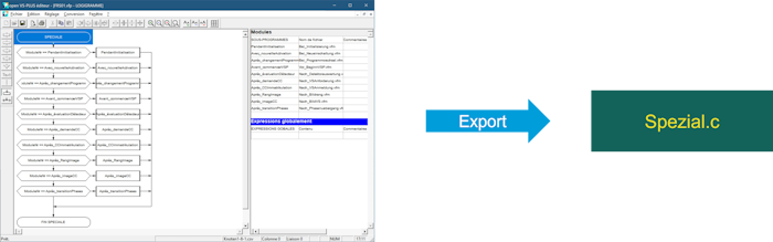 In den 6'er Versionen von vs | plus ist der Export aus dem Editor immer eine C-Datei. Dieser Export kann nicht direkt im vs | emulator oder im Steuergerät eingesetzt werden.
