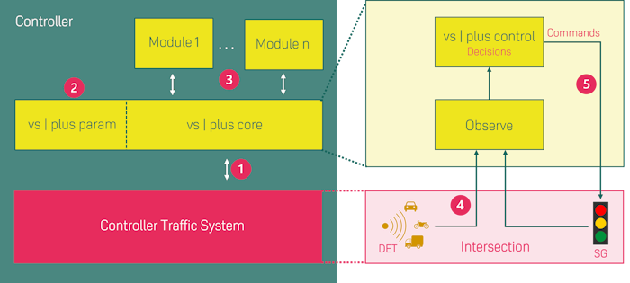 vs | plus param: The vs | plus core requires parameters in order to control (2). These parameters are decisive for control with vs | plus. It is not necessary to be able to programme. To get a vs | plus control system up and running, you need the knowledge of a traffic engineer and not a degree in computer science. To extend the standardised and parametrised control system created with vs | plus, there is a special interface to the vs | plus core, called open vs | plus. This enables vs | plus to intervene in the standardised process.