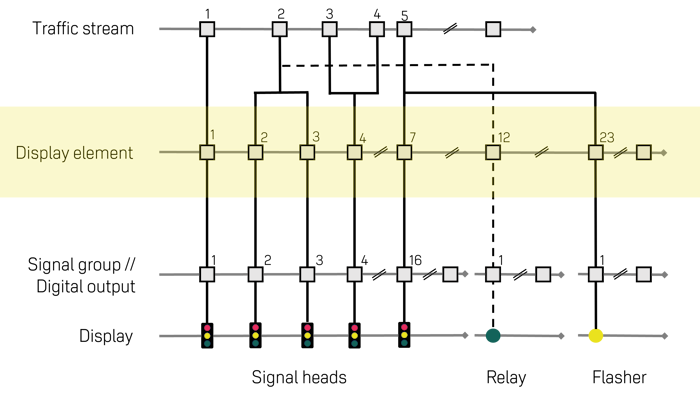 The display element is the link between the traffic stream on the vs | plus side and the signal groups or digital outputs on the control unit level. There must be a display element in vs | plus for each signal that is to be switched on the road.