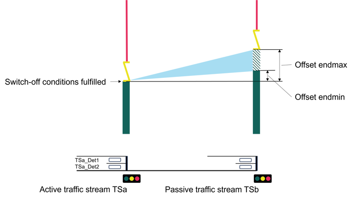The counterpart to the led is the trailing end. It is triggered at the green end. The holding of an offset up to the maximum duration "End_max" is initially dependent on the current lengthening time gaps of the two detectors det1_a and det2_a at the stop line of TS_decis (TSa). One of these two time gaps must be smaller than "End_max". The switching of the offset duration "End_min" depends on the detectors assigned to TS_dep (TSb). As long as one of these time gaps is smaller than "End_max", an offset is controlled up to a minimum of "End_min". The following conditions then apply. The switching of the offset duration "End_max" depends on the detectors assigned to TS_dep (TSb). As long as these report traffic, an offset is controlled up to "End_max". An overrun depends on whether the time gaps of the loops det1_a and det2_a of the relevant traffic stream TS_decis (TSa) are smaller than the entered value End_max.
