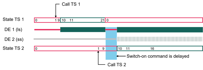 In the event of a request for traffic stream TS 2 after DE 1 has already received green, the interlock at the level of the traffic streams causes TS 1 to be closed when TS 2 is opened. TS 2 does not switch DE 1 as it is already open and at the same time the interlocking at the level of the display elements prevents the activation of DE 2. As a result, the audible signal remains silent for the entire release time.