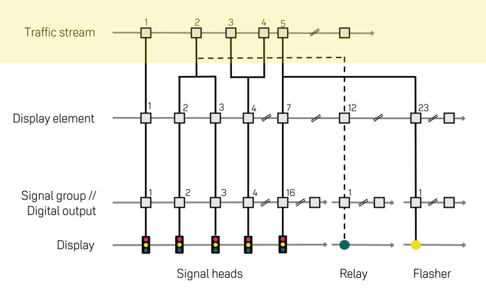 With the traffic stream, vs | plus is able to switch the signal groups at the intersection and react to the detectors or message points.