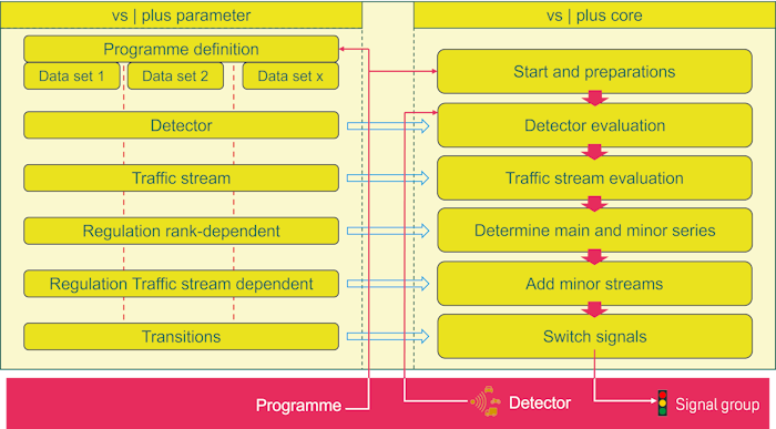 Each of the modules in the vs | plus core manages variables. These can be timers (e.g. detector waiting time, traffic stream waiting time), states (e.g. traffic stream state) and many others. With the appropriate knowledge, you can change these variables so that the decisions correspond to your wishes.